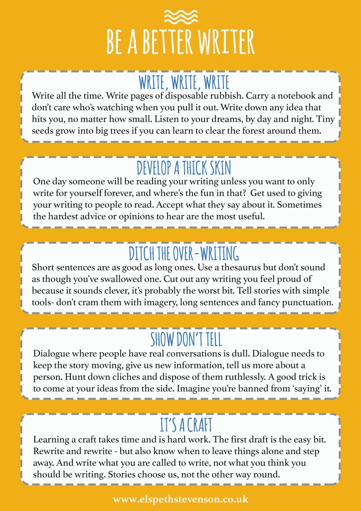 Useful summary sheet with the best advice for aspiring writers summarised at a glance. All the things you wish someone had told you at the start of your explorations in wordsmithery on a piece of A4? Well, not quite! This is the start of a ‘Better Writer’ series, so watch this space. Although aimed at younger writers just starting out, guess what…we can all learn from these.