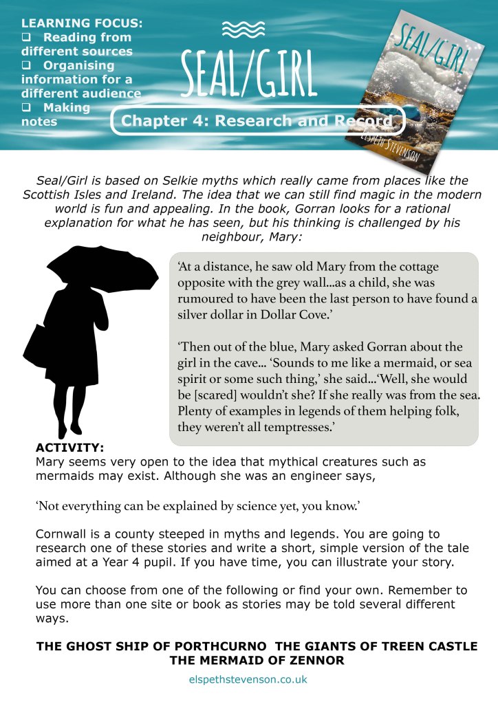 There are two resources for Chapter 4, which can be used in sequence or as a choice. The first asks pupils to think about the character of Mary, who acts as a bridge between myth and reality for Gorran. Pupils are asked to research their own Cornish myth, and to re-write it for a younger audience.